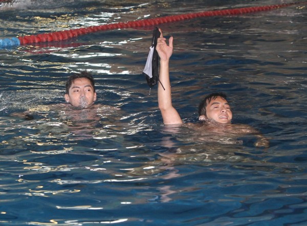 〔記者吳志偉/台北報導〕台視8點檔「雨後驕陽」連續幾天收視破3,雖然即將完結篇,但劇組演員王凱、古斌依今兌現承諾,到游泳池裸泳慶功,只不過水深有3公尺,讓兩人又要一手高舉泳褲,一邊游泳讓自己浮起來,都不小心吃了好幾口的水。