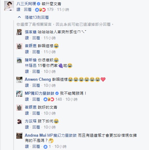 鼓鼓的這席話,立刻引起不少網友熱烈迴響,但也隨即被阿璞酸他「裝什麼文青」,有網友替鼓鼓緩頰「人家突然感性」、「幹嘛這樣」,鼓鼓後來也親上火線說:「我不能聞腋嗎?」最後還有網友問鼓鼓:「聞起來怎樣?」他立馬回:「像鬆餅。」