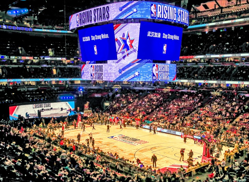 今年2月NBA明星賽週新秀挑戰賽,芝加哥聯合中心球場大螢幕出現「武漢加油」口號,過不到一個月NBA就因為武漢肺炎被迫停賽。(資料照)
