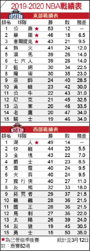 依聯盟規定,球員感染得被迫停賽2週,不過,由於其接觸範圍太廣,加上疫情已遍地開花,賽季停擺期勢必延長,美媒推估,可能至少1個月後才會再度重啟,讓原定美國時間4月18日登場的季後賽也很難如期開打。