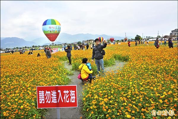 「好美的花海!」遊客抵達三星鄉花海,被美麗花海景觀深深吸引,大家拿出相機猛拍照,驚嘆聲連連;鄉長黃錫墉希望藉由花海、熱氣球賣點,把地方旅遊熱潮延續到春節。