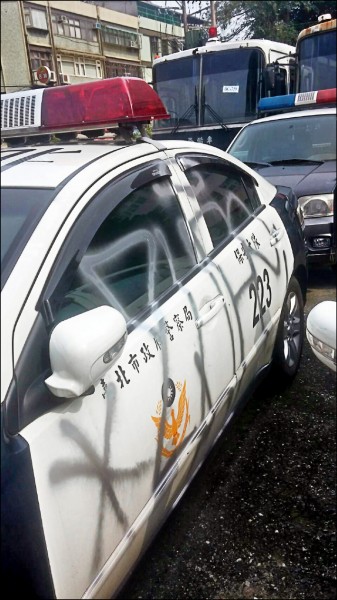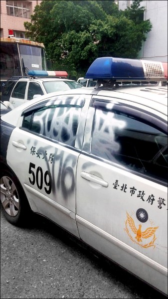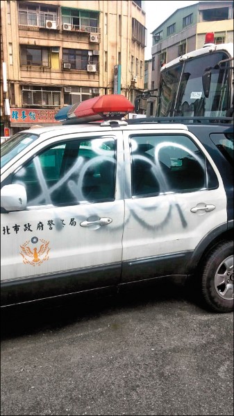 台北市保安大隊警車遭人噴漆塗鴉。(記者姚岳宏翻攝)